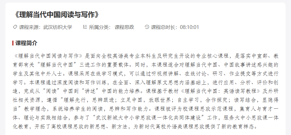 武汉纺织大学“理解当代中国阅读与写作”课程的全线上线,是学校积极响应国家号召、深化教学改革的丰硕成果,也是其办学实力与社会担当的集中体现。它预示着,“理解当代中国”正从一门高校课程,演变成为一个开放、共享、持续发展的国家级知识体系,为培养担当民族复兴大任的时代新人贡献着坚实的“纺大力量”。