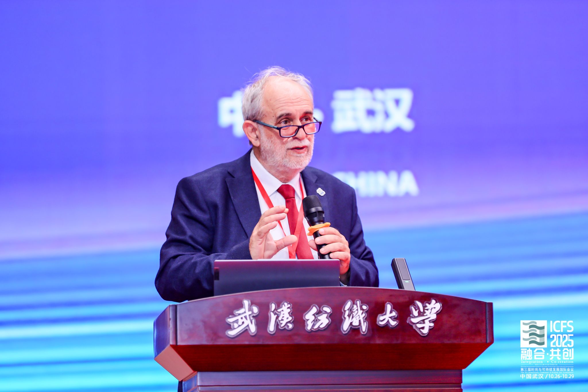 Raul Fangueiro在报告中聚焦于对天然废弃物的价值重构,他的研究团队致力于将香蕉叶、菠萝叶等农业副产品及海洋废弃藻类,通过生物与物理技术转化为高价值纤维材料。具体创新包括利用果胶酶处理优化纤维性能,开发适用于非织造布与生物基复合材料的解决方案;从藻类中提取环保色素以替代合成染料;并研制基于聚己内酯与壳聚糖的纳米纤维膜,用于纺织废水处理。该研究为纺织行业提供了从废弃物到高性能材料的可持续循环路径,有力推动了产业绿色转型与资源效率提升。