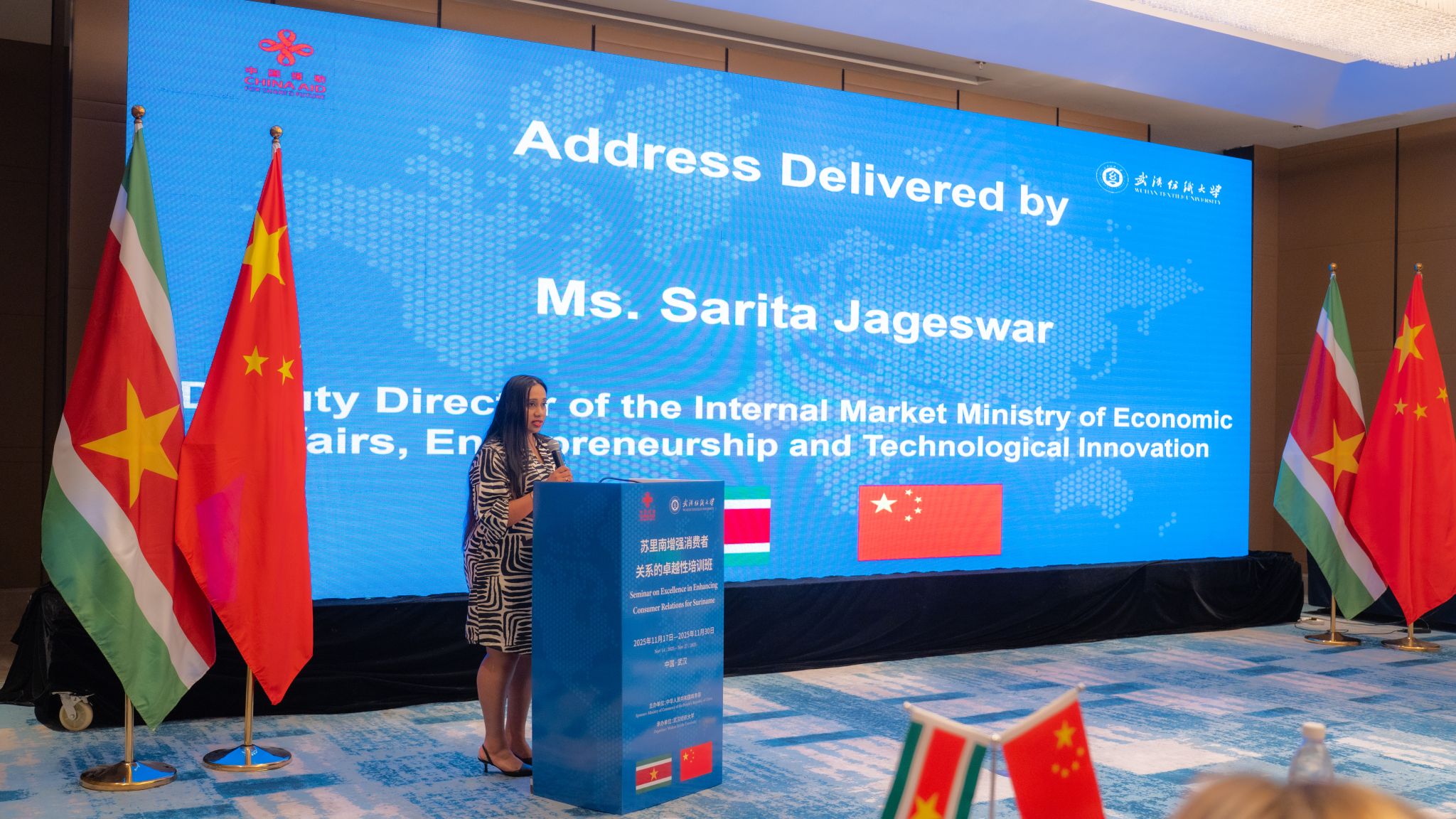 苏里南经济事务、创业与技术创新部国内市场处副主任Sarita Jageswar女士作为学员代表发言。她表示,通过系统学习,学员们深入了解了中国在消费者保护与沟通领域的政策体系与创新实践,有助于苏里南制定更有效的消费政策,构建更公平透明的市场环境。