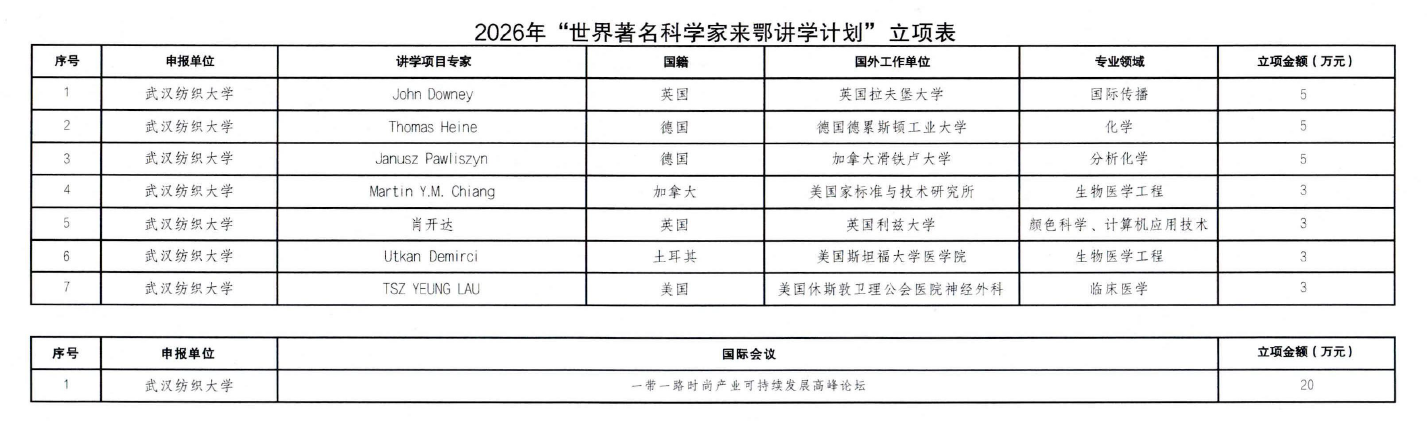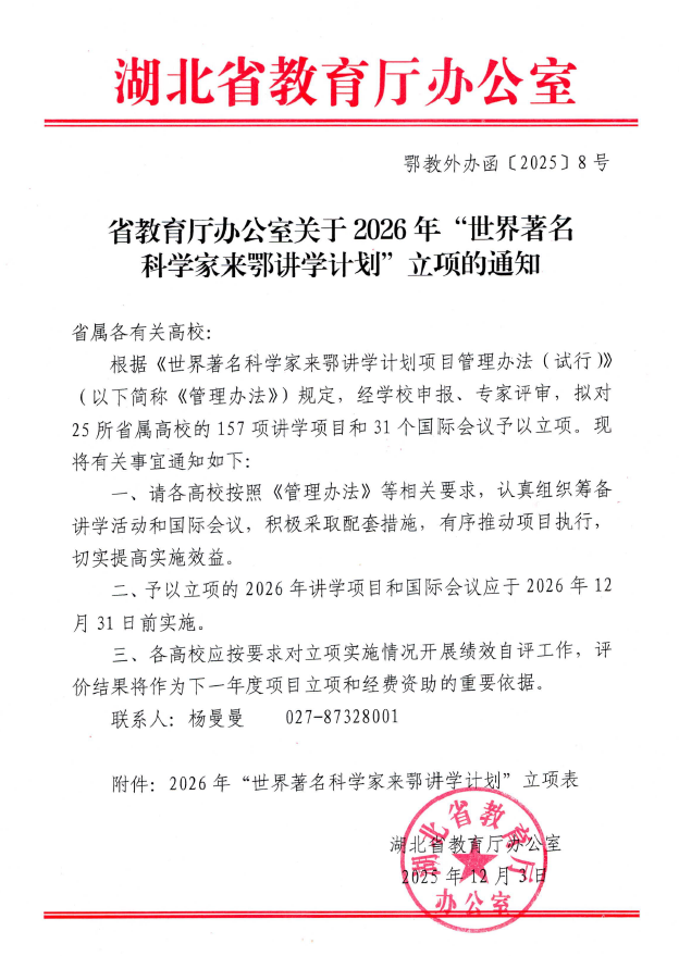 近日,2026年度“世界著名科学家来鄂讲学计划”评审结果正式揭晓,我校共有7项专家讲学类项目和1项国际会议类项目成功获批,立项总数创近年历史新高。