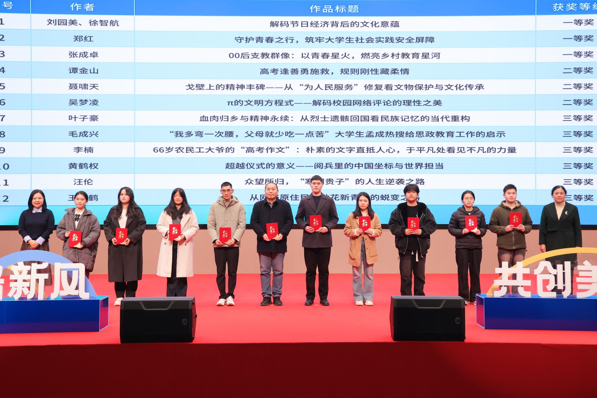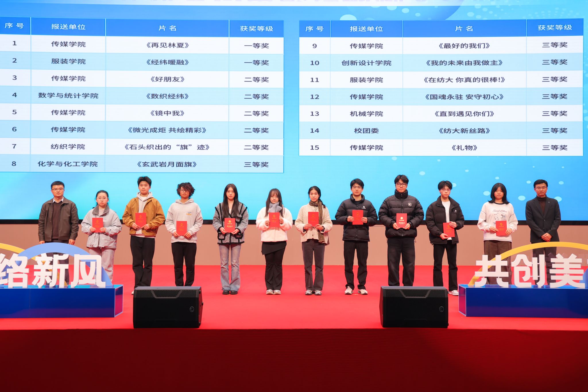 颁奖环节,2025年度“奇妙纺织 美好生活”纺织科普抖音挑战赛、优秀微电影短视频大赛、校园IP形象设计大赛、第二届“经纬好评”校园网络评论大赛、校园新媒体优秀账号,以及国家广播电视总局2025年“与时代同行”原创网络视听优秀网络纪录片等优秀作品获奖单位和个人分别上台接受表彰,每一项荣誉的颁发,都是对创作者辛勤付出的高度肯定,更是对校园网络文化建设成果的集中检阅。