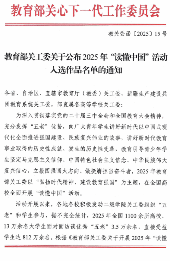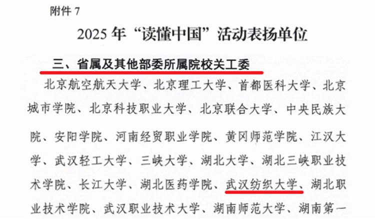 日前,根据《教育部关工委关于公布2025年“读懂中国”活动入选作品名单的通知》(教关委函〔2025〕15号),武汉纺织大学关心下一代工作委员会荣获教育部关工委2025年“读懂中国”活动表扬单位,为湖北省获此荣誉的16所高校之一。