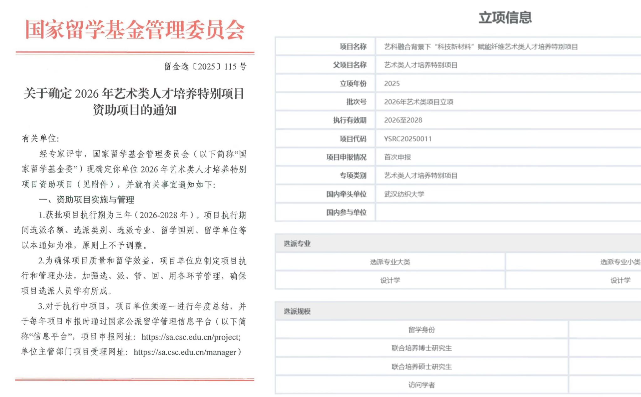 日前,国家留学基金委公布了2025年艺术类人才培养特别项目的评审结果,我校作为唯一牵头单位申报的“艺科融合背景下‘科技新材料’赋能纤维艺术类人才培养特别项目”获得立项,这是我校继地方合作创新子项目后获批的又一个国家级的国际人才培养平台。
