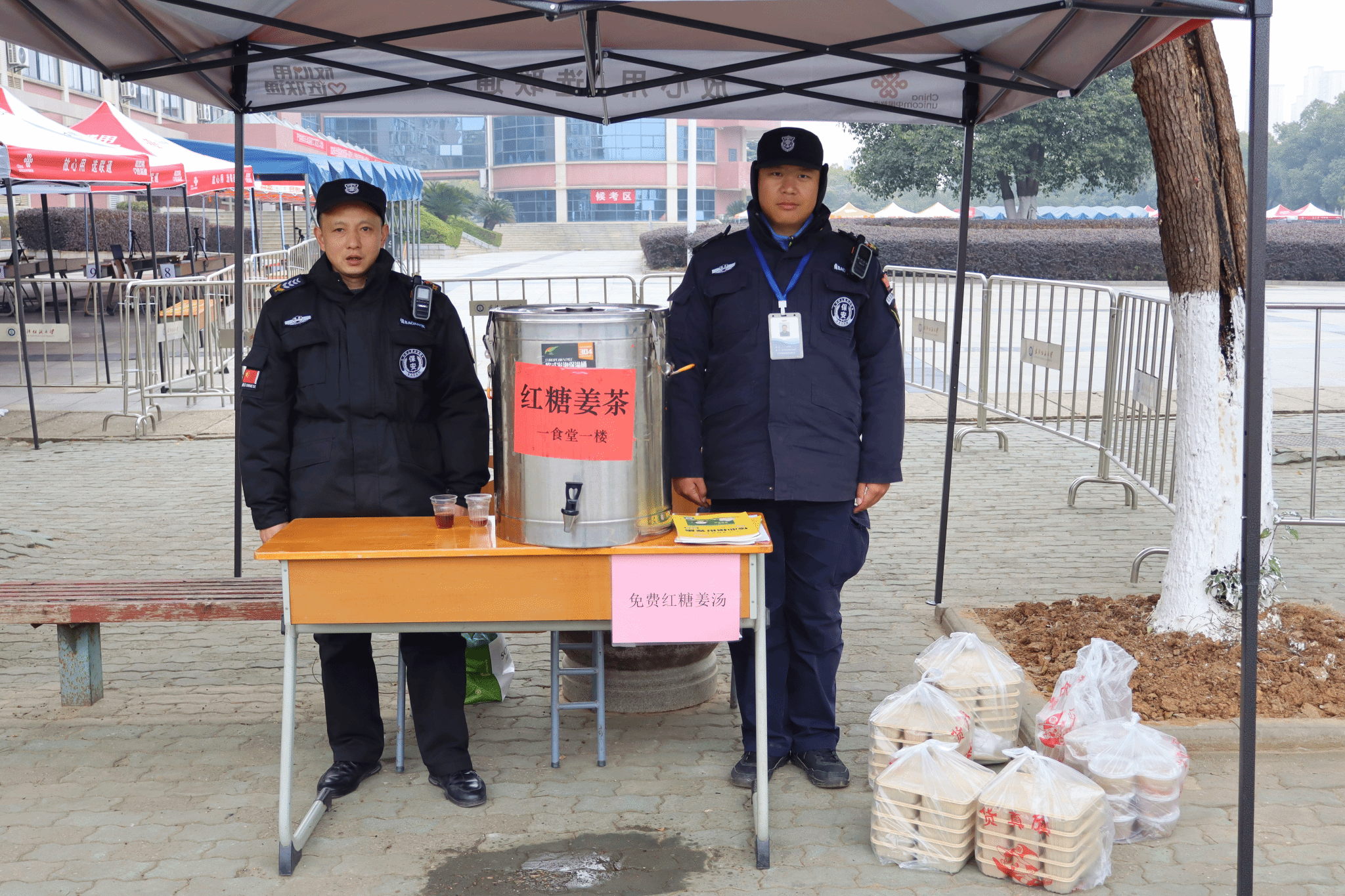 一食堂及三号教学楼设置考研专属备考休息区,为学生提供温暖舒适备考休息场所。南湖校区设置“考研专车”,接送考生和考务人员往返考场。保卫处安排工作人员,实时疏导交通,提供指引服务。校医院安排值班医生,为突发身体健康状况的考生提供就诊服务。后勤保障处为考生准备了丰盛可口的午餐,并提供了免费热姜茶和薄荷糖。