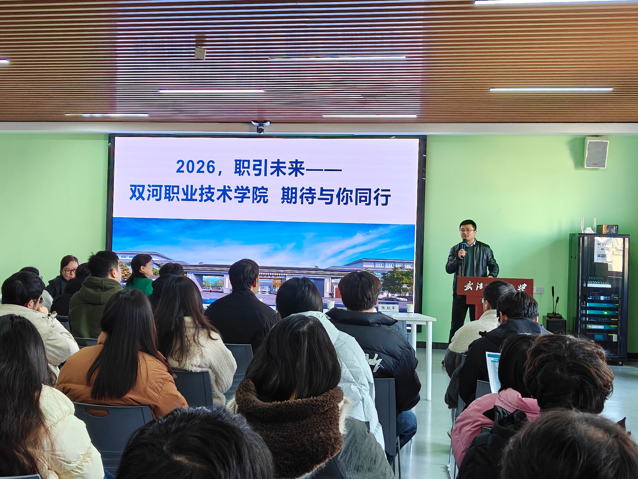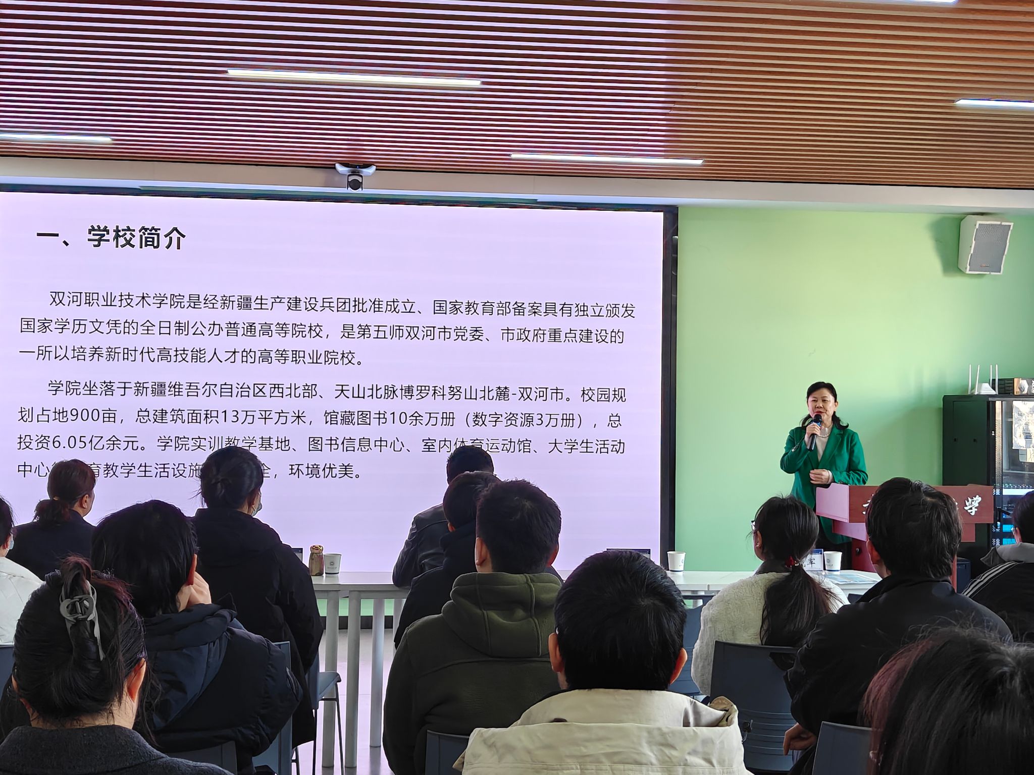 活动伊始,与会各方一同观看了新疆第五师及双河职业技术学院宣传片。贾光昕督学结合国家对新疆及兵团的战略部署,详细介绍了新疆及第五师双河市的发展现状、政策红利与未来前景。她表示,近年来新疆依托国家扶持政策,交通基础设施持续完善、生态环境愈发优美、营商与宜居环境不断优化,正处于高质量发展的黄金时期,迫切需要各类高素质人才扎根奉献。随后,贾光昕督学重点推介了双河职业技术学院的办学定位、专业布局、发展规划,以及教师岗位的薪资待遇、住房保障、子女教育等完善的生活配套服务,打消了毕业生的后顾之忧。