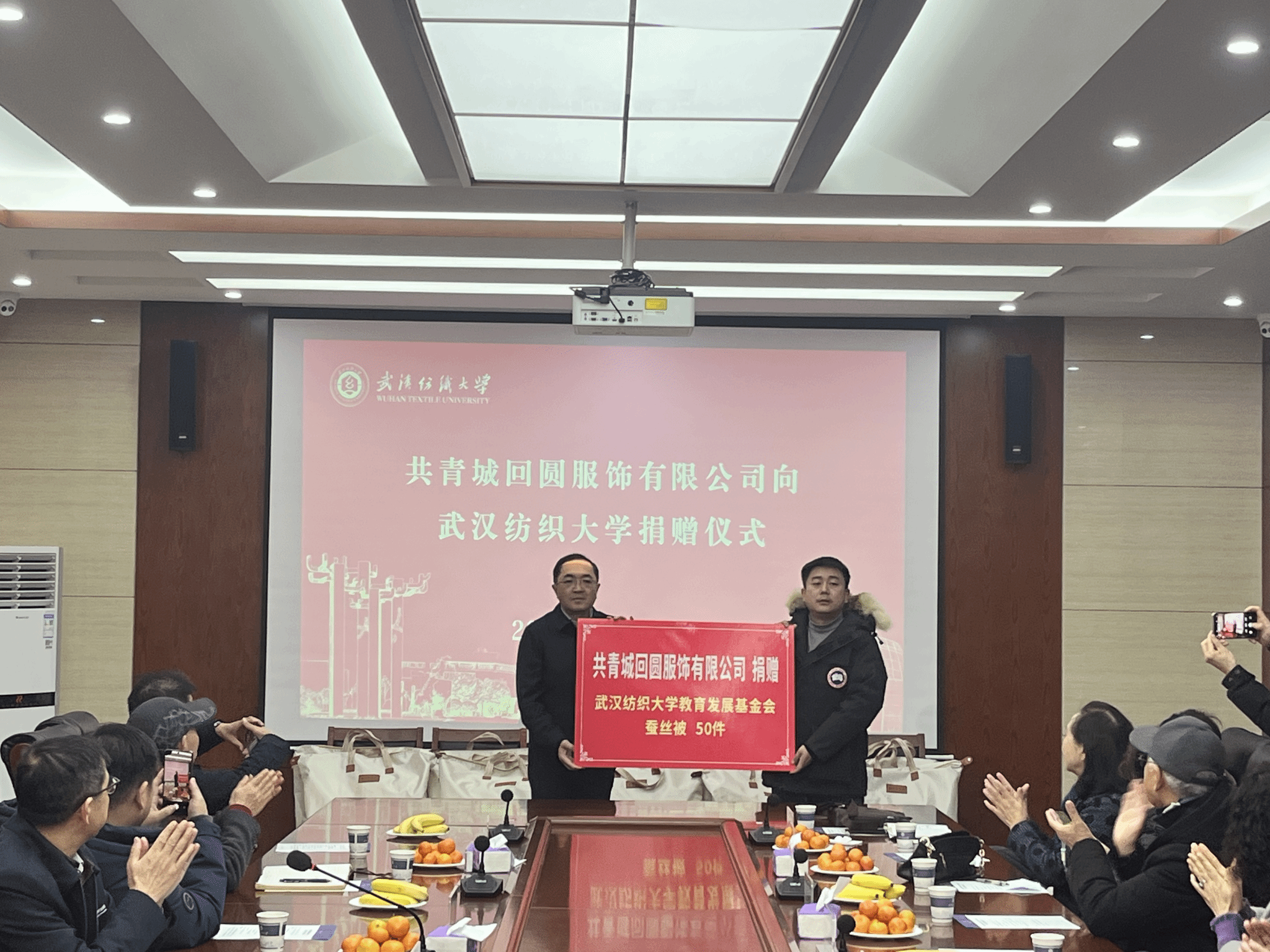 会上,共青城回圆服饰有限公司向武汉纺织大学捐赠暖冬物资。该公司总经理史俊代表企业向学校捐赠蚕丝被50件,校长傅欣代表学校接受捐赠。捐赠仪式结束后,傅欣与公司负责人一同向在场离退休老同志发放慰问物资,表达学校的关怀与社会的温暖。