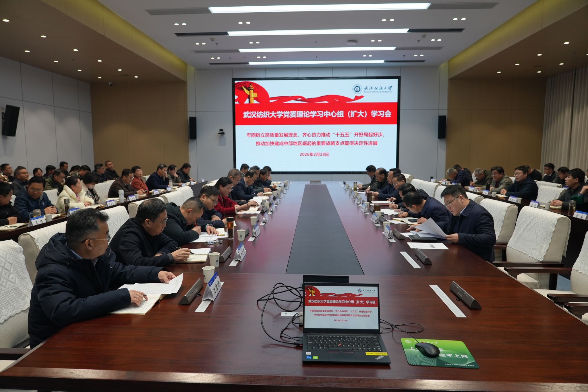 2月28日下午,武汉纺织大学党委理论学习中心组(扩大)学习会在阳光校区建全会堂崇真厅召开。本次学习会的主题是“牢固树立高质量发展理念,齐心协力推动‘十五五’开好局起好步,推动加快建成中部地区崛起的重要战略支点取得决定性进展”。全体校领导,两委委员,全体中层正职参加学习会。校党委书记徐卫林主持会议。