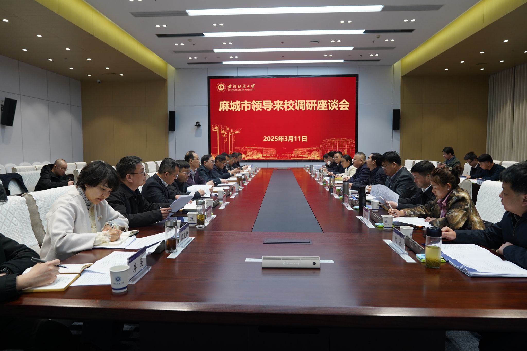 会上,麻城市科技和经信局、市文化和旅游局、市信安国融集团、市产业发展服务中心、孝感乡公园管理中心、湖北凤凰白云山药业有限公司、麻城华棉纺织有限公司等相关负责人与我校校办、组织部、研究生院、本科生院、发规处、科发院、财务处、纺织学院、马克思主义学院、全国重点实验室等部门负责人围绕校地合作、产教融合、科技成果转化等方面工作进行了交流。