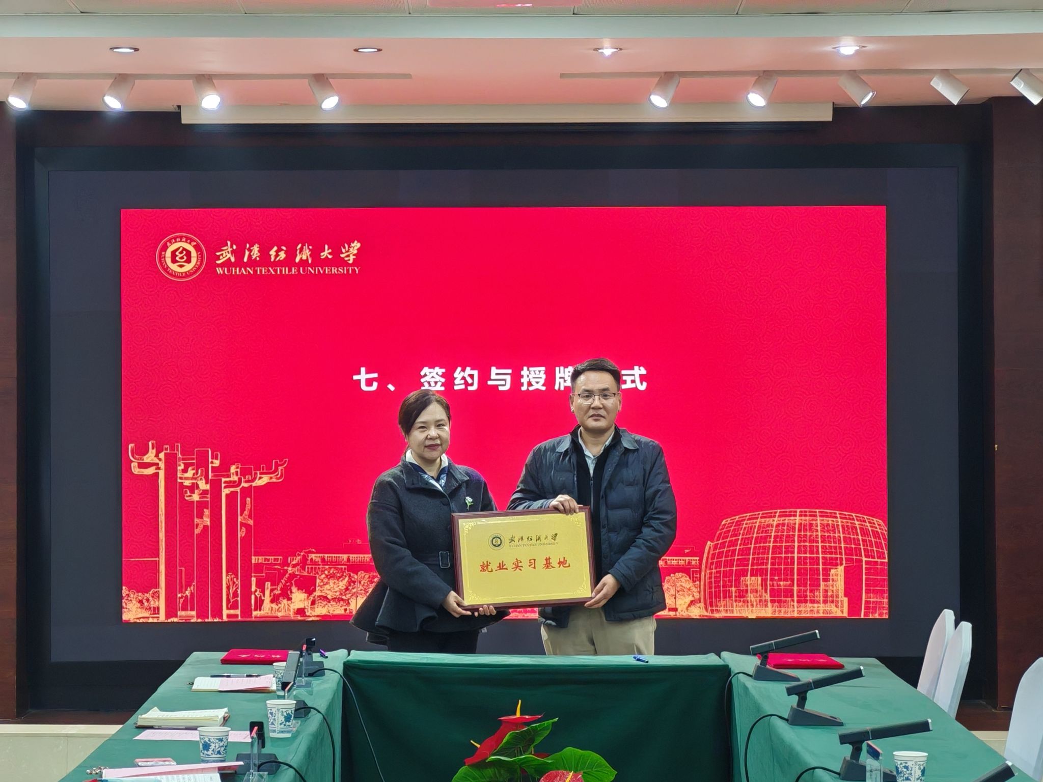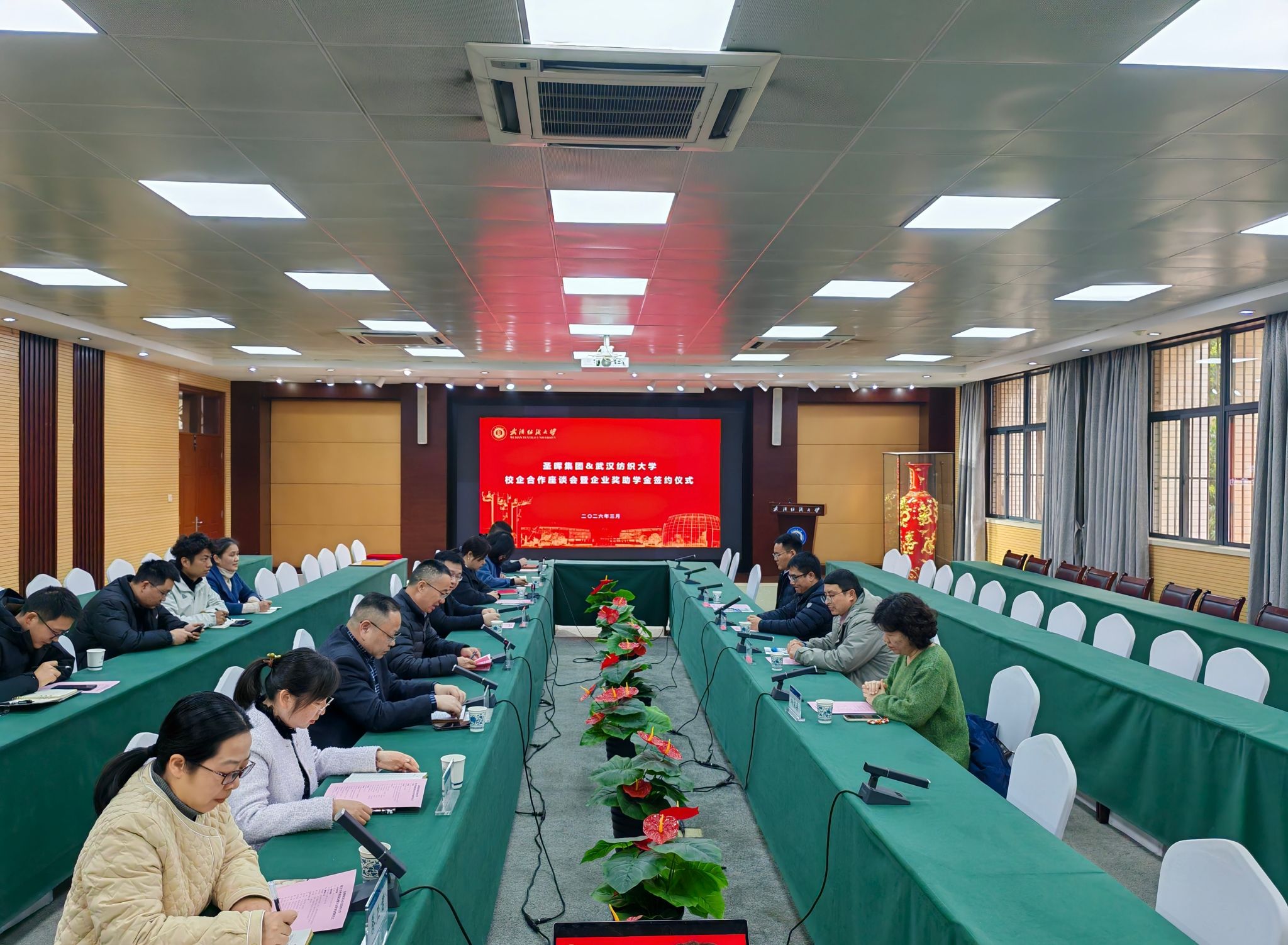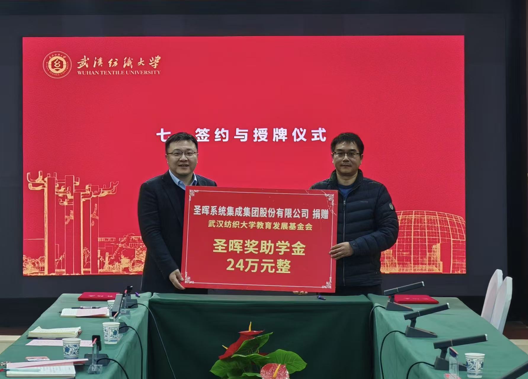 3月20日下午,圣晖集团与武汉纺织大学校企合作座谈会暨“圣晖集团奖助学金”签约仪式在阳光校区行政楼115会议室举行。圣晖集团协理周雄健、技术总监衡永作为校友重返母校共商合作。会前,校长傅欣亲切会见了圣晖集团、泛亚机电的校友。校党委常委、副校长王栋,学工部、学生就业指导处、校友处负责人,资环学院、电气学院领导班子及师生代表共同出席活动。会议由资环学院党委书记郭俊主持。