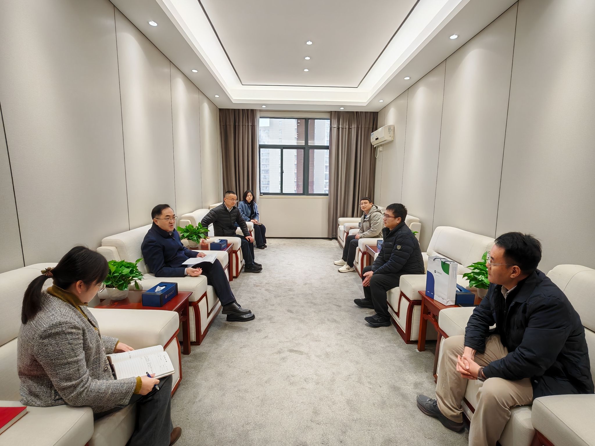 傅欣对三位校友返校表示热烈欢迎,对他们长期以来关心和支持母校发展表示感谢。他指出,校友企业设立奖学金、共建实习基地,是校友对母校深厚感情的生动体现,也是深化产教融合的重要举措,希望双方以此次合作为契机,在人才培养、科研攻关、成果转化等方面开展更深层次的合作,共同助力学生成长和企业发展。周雄健表示,重返母校倍感温暖,感谢学校的培养和信任,圣晖集团将积极履行企业社会责任,用好校企合作平台,吸引更多纺大学子加入企业,实现校企共赢。