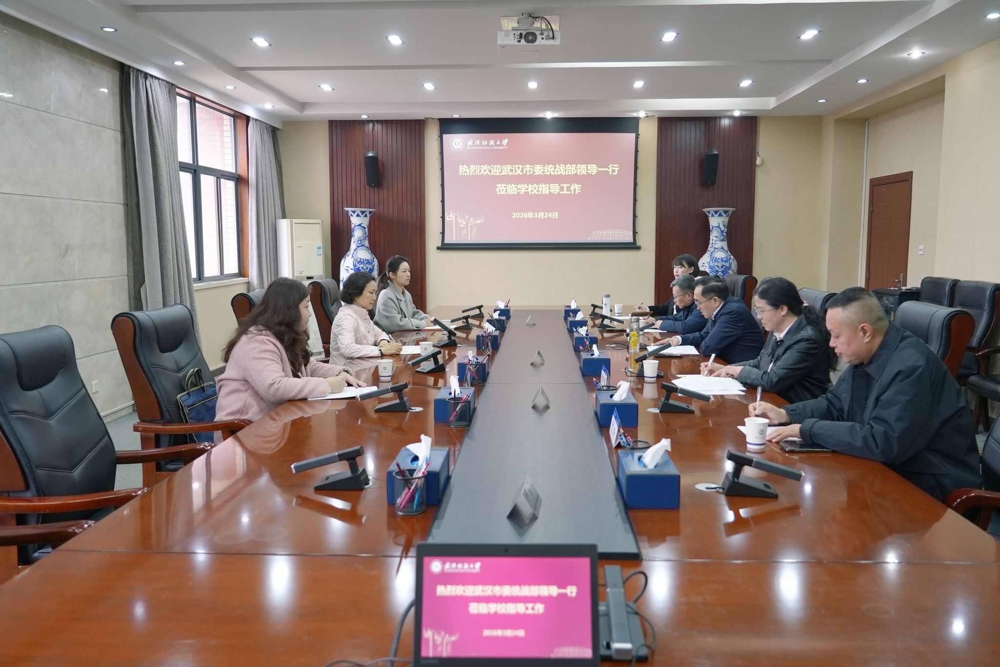 3月24日上午,武汉市委统战部二级巡视员胡素文,联络和侨务工作处副处长姚丹、一级主任科员陈文佳一行莅临我校阳光校区,调研指导学校统战工作。调研工作座谈会在学校阳光校区行政楼四楼1号会议室召开,校长傅欣出席会议,党委统战部常务副部长曾令玉主持会议,民革纺大支部主委贾琦、九三纺大委员会主委沙莎、致公党纺大支部主委夏东升等党外代表人士参加座谈。