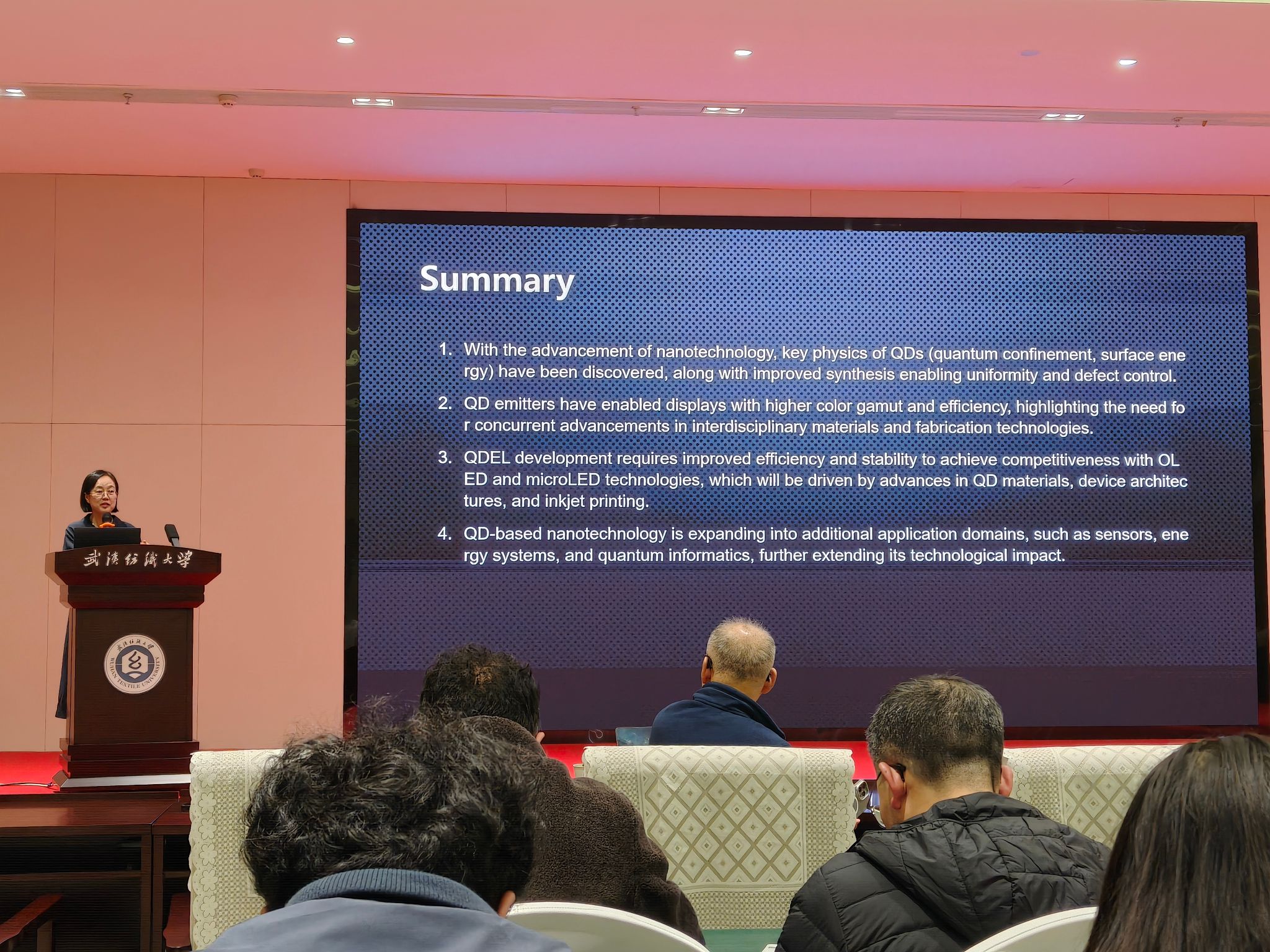 党委人才工作办公室、纺织新材料与先进加工全国重点实验室、微电子学院于3 月26 日下午联合举办专场学术沙龙,邀请两位专家带来光电器件与显示前沿技术讲座。Eunjoo Jang 教授以《Perspectives On Quantum Dot Technology: Small Success & Big Impact》为题,系统回顾了量子点技术从基础物理发现到高端显示产业核心应用的完整发展历程,展现了微纳技术突破对全球产业格局的深远影响。James (Jueng-Gil) Lee 博士以《The Latest Technology Breakthroughs of Flexible Printed OLED Display Technology》为题,介绍了柔性印刷OLED 显示技术的最新进展,同时结合产业化路径探讨了该技术在智能终端与新型显示场景中的未来发展趋势。两场报告为师生带来了兼具学术深度与产业视角的光电显示科学与前沿技术信息。