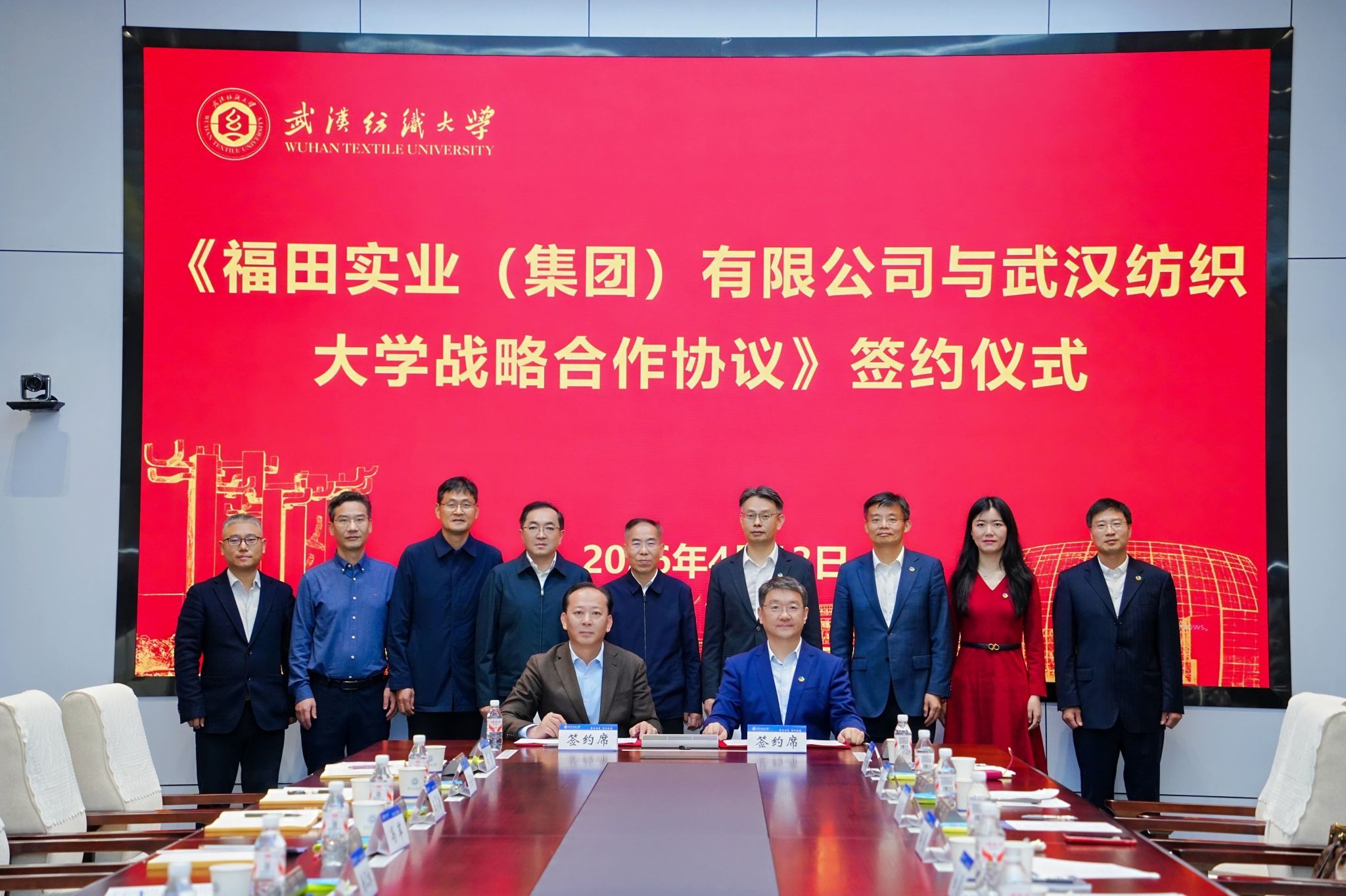 中国中纺集团党委委员、副总经理兼福田实业董事会主席郗强和武汉纺织大学副校长冯军分别代表双方签署《福田实业(集团)有限公司与武汉纺织大学战略合作协议》。徐卫林、白勇等人共同见证双方签约仪式。