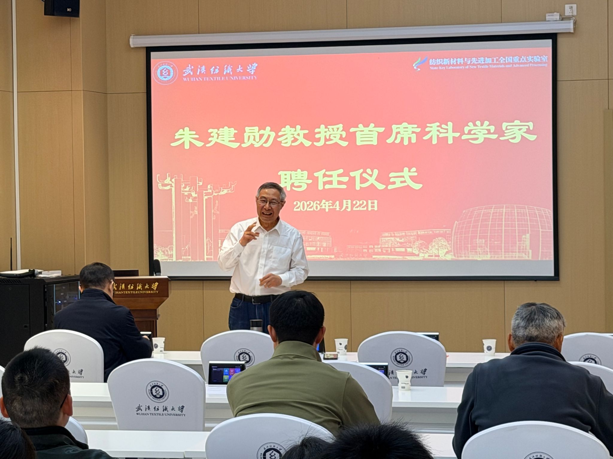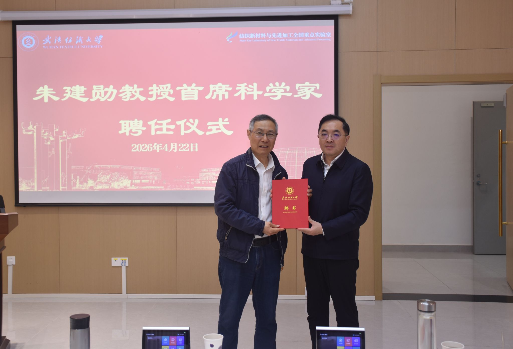 4月22日上午,学校在建全会堂雄楚厅举行首席科学家聘任仪式。校长傅欣出席并为朱建勋教授颁发聘书。纺织新材料与先进加工全国重点实验室常务副主任杨应奎教授主持仪式,全国重点实验室全体教师参加活动。