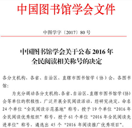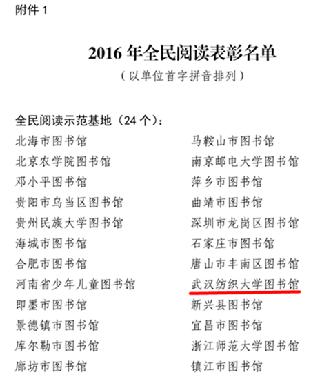 10月10日,从中国图书馆学会传来消息,我校图书馆荣获全国“全民阅读示范基地”荣誉称号,这是我校图书馆继获得2014年、2015年“全民阅读先进单位奖”之后,再一次荣获的国家级表彰图书馆的最高奖项。该奖项旨在表彰在全国范围内组织和开展全民阅读活动中,组织得力、内容丰富、形式新颖、贡献突出的优秀代表。湖北省仅有2所图书馆获此殊荣。
