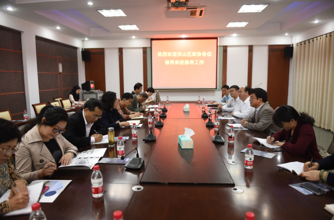 4月14日上午,武汉市洪山区政协副主席刘丹峰、区政协常委梁桂芳、区政协办公室主任叶康明以及区政协教育委员会全体委员一行近30人到校调研生源基地建设、民主党派活动开展等事宜。校党委常委张文凯接待了刘主席一行,洪山区政协委员、纺织学院教授陈益人,统战部及招生就业处负责人参加了调研活动。