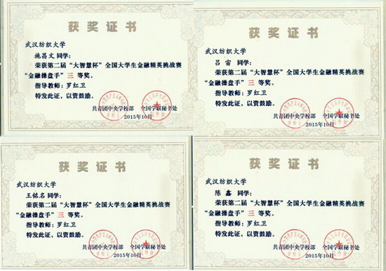 近日,历时两个多月的第二届“大智慧杯”全国大学生金融精英挑战赛落下帷幕,经过预赛、复赛的激烈角逐,我校经济学院罗红卫老师指导的王铭名、吕宙、陈鑫、施昌文四名同学荣获“金融操盘手”三等奖。