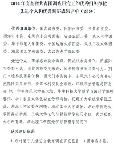 日前,从市政协、团省委相继传来喜讯,我校资产实验处赵金龙老师和服装学院叶洪光教授依托湖北省非物质文化遗产研究中心共同完成的《汉绣市场资源整合优化调研报告》获2014年度市政协优秀研究成果三等奖;校团委申报的课题《基于导师制的青年群体积极心理品质培育模式研究》获评2014年度全省共青团调查研究工作优秀调研成果,该项目主要负责人纺织学院严蔷薇老师获评先进个人,传媒学院分党委副书记段溢波主持的《网络流行对大学生价值观的影响及对策研究》获批2015年度项目立项。