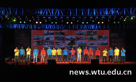 “海上生明月,天涯共此时。”在皎洁的月光下,我校2013“纺飞梦想,织因有你”中秋暨迎新文艺晚会在阳光校区体育场圆满举行。5000多名2013级新生和全体军训教官一起欣赏了一场精心准备的视觉文化盛宴。空军预警学院黄陂士官学校政委黄志敏,我校校长韦一良,校党委副书记刘义,党委副书记、纪委书记刘功成,副校长罗锦银,武汉广播电视台音乐广播总监赵明,中国联通江夏分公司副总经理徐向明和全体新生一道喜迎中秋佳节。