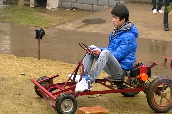 上午10点比赛开始,各组选手轮流驾驶自己的爱车展开了冠军的角逐。这时天空下起了小雨,卡丁车在赛道上溅起的水花和泥浆更平添了一份“越野”的感觉。驾车的选手紧张、自信地处理每一个转弯和坡道,观战的同学大声呼喊加油,现场气氛热烈而愉快。经过最后记时排序,赵开勤老师宣布第5组获得冠军,全组同学本次金工实习成绩加5分。
