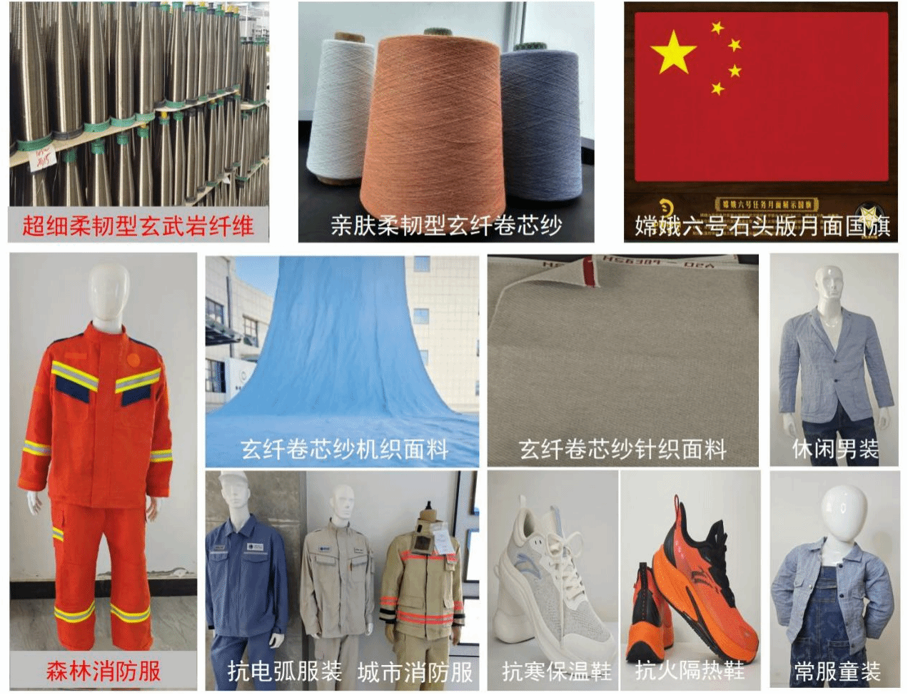 目前,该系列产品已与湖北汇尔杰新材料科技有限公司、际华三五四二纺织有限公司、武汉裕大华纺织有限公司、安踏集团、航宇救生装备有限公司等多家企业开展合作开发与生产应用,为航天服、月面帐篷、飞船内饰、航空飞行器座椅套等提供核心材料支撑。经过全国技术严格筛选,本项目技术产品入选和受邀在央视节目《中华考工记》中展示(近期将在央视一套播出,以实际节目播出安排为准)。2025年6月25日,中国纺织工业联合会组织成立了权威专家组,到玄武岩纤维先进纺纱加工技术生产现场鉴定,一致认为卷芯纺纱技术达到了国际领先水平。本项目汇聚了武汉纺织大学、汇尔杰新材料科技股份有限公司、武汉裕大华纺织有限公司、际华三五四二纺织有限公司、江阴海澜科技有限公司、安踏(中国)有限公司、鲁泰纺织股份有限公司、云南凤滢实业有限公司、溢达纺织有限公司等企业,通过“矿石原料-纤维纺丝-纺纱织造-印染整理-服装品牌-航空航天等全产业链”的校企交叉融合式创新,构建了完善的生产与质量保障体系,创建并运营了玄武岩超细柔韧化纤维、卷芯复构纱线和面料制品(见图3)产业化生产线,工艺技术成熟,设备运行稳定,实现了低损、低扭、全包覆的玄武岩纤维卷芯复构纱及其制品的工业化生产,从军工航天到民用防护,显著提升了国产高端防护纺织品市场竞争力和产业链自主可控能力。2025年9月项目技术荣获2025年度中国纺织工业联合会科技进步壹等奖。