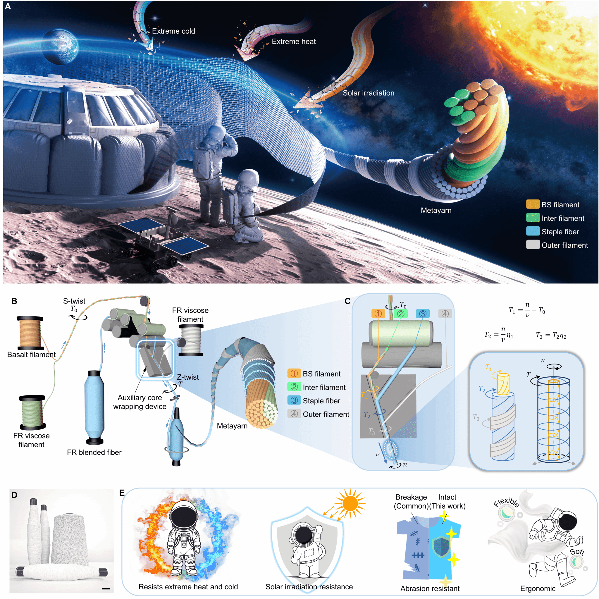 近日,纺织新材料与先进加工全国重点实验室徐卫林院士团队夏治刚教授课题组联合陶光明教授(国家杰青),在Matter期刊发表题为“Hierarchical basalt metayarn for ergonomic protective space textiles”的研究论文(论文连接:https://doi.org/10.1016/j.matt.2025.102481)。该纺纱新材料与先进加工课题组首次提出了卷芯纺纱技术“coaxial spiral wrap spinning”,解决了玄武岩纤维在超细尺度下无损、低扭、高品质、批量化纺纱、织造、服用难题,为高刚高脆无机纤维材料的大规模亲肤柔韧型纺织加工开辟了新途径,可批量化满足航空航天领域对高性能防护材料抵御复杂极端环境的迫切需求。论文第一作者为夏治刚教授,通讯作者为徐卫林院士、陶光明教授。