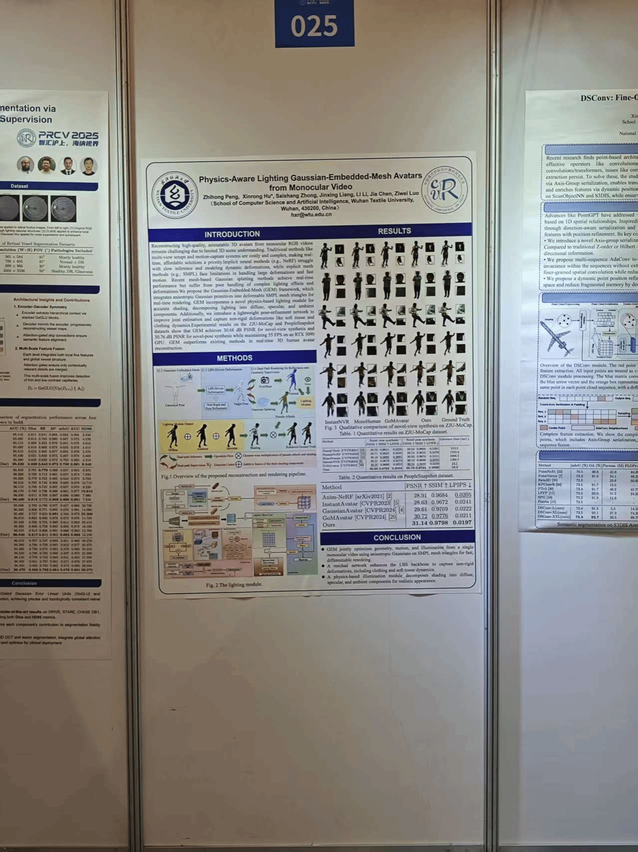 计算机学院2023级硕士研究生彭志宏同学的论文《Physics-Aware Lighting Gaussian-Embedded-Mesh Avatars from Monocular Video》成功入选PRCV 2025,并于10月17日进行了海报展示。该研究针对单目视频重建高质量、可点亮的3D数字人这一挑战性问题,提出了一种创新方法,通过将物理光照信息嵌入高斯表示的网格中,显著提升了重建头像的逼真度和光照适应性。该方法在保持计算效率的同时,实现了更高质量的3D头像重建,为虚拟现实、数字人等应用提供了有力支持。