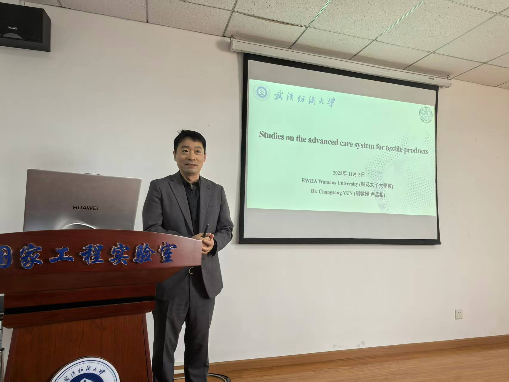11月3日,应我校国家地方联合工程实验室邀请,韩国梨花女子大学的YUN教授来我校进行学术交流,开展了以“纺织品高级护理系统研究”为主题的学术报告,报告由国家地方联合工程实验室主任王金凤教授主持,技术研究院师生和留学生代表参加了报告会及讨论。
