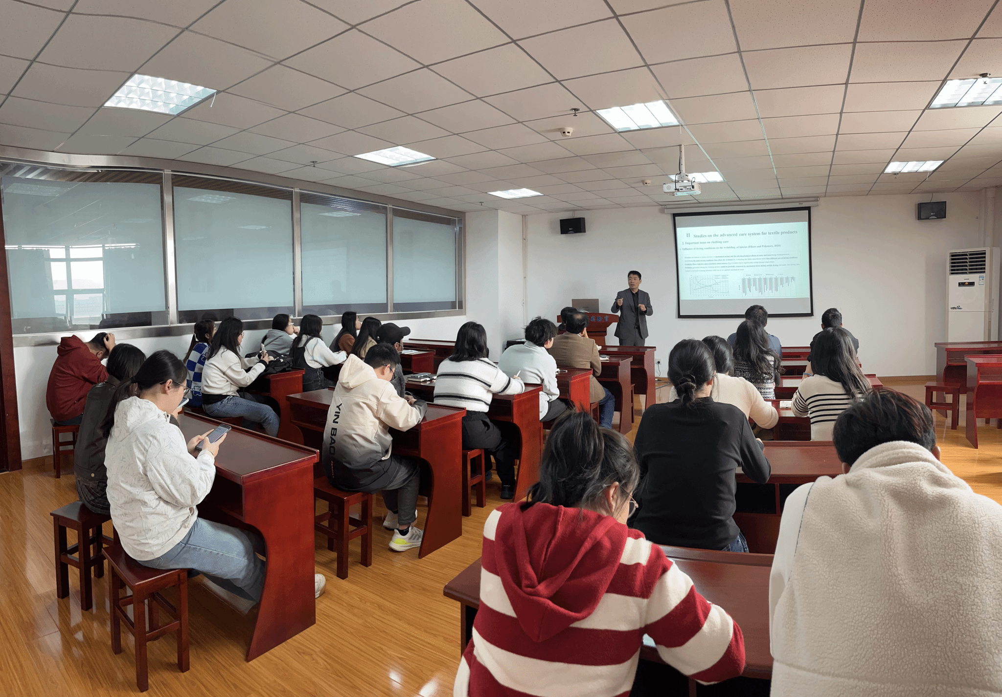 此外,YUN教授还就功能性服装的科学维护、自清洁纺织品的创新技术以及纺织品虚拟化与遗产保护等前沿领域进行了展望,为在场师生打开了新的研究思路。整场报告数据详实、案例生动,充分体现了产学融合的独特魅力。报告结束后,YUN教授与在场师生就护理技术细节、行业标准与未来趋势等话题进行了深入交流,为将来的研究发展提供了新的灵感。