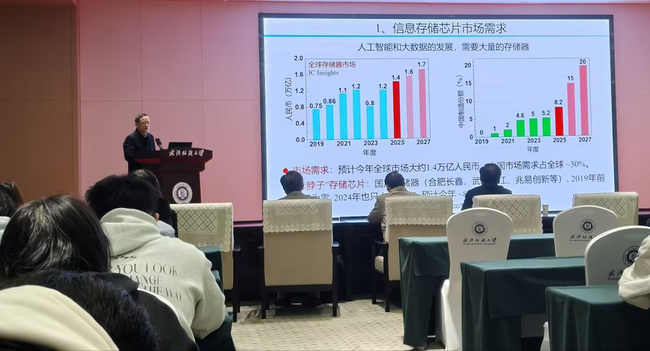 11月12日上午,武汉纺织大学第879期阳光论坛暨新一代信息技术高端论坛在阳光校区建全会堂全棉时代厅举行。本次论坛由微电子学院主办,特邀国家级人才项目入选者、中国科学技术大学李晓光教授为学院师生作题为“HfO2基电子材料与信息存储器件”的学术报告。微电子学院教师、研究生和部分本科生参加了论坛。论坛由副院长(主持工作)何云斌教授主持。