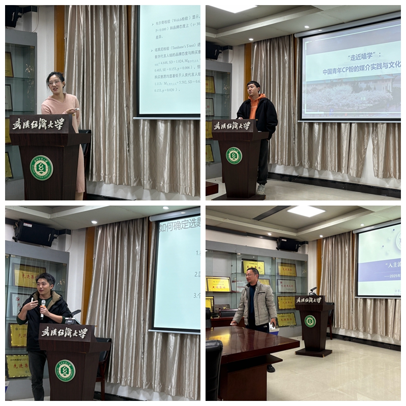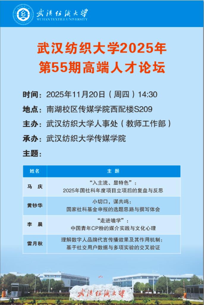 11月20日下午,武汉纺织大学第55期高端人才论坛在南湖校区西经楼S209举行。本次论坛汇聚了传媒学院雷月秋、李晨、黄钞华、马庆四位教师,围绕数字人传播、青年文化心理、国家社科基金年度项目申报等前沿议题,以严谨治学之姿,展学术探索之思,为在场师生带来一场思想激荡的学术盛宴。该活动由传媒学院承办,副院长马庆主持,传媒学院师生及兄弟学院部分师生共四十余人参会。