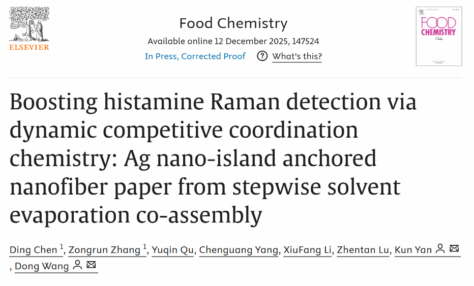 近日,纺织纤维及制品教育部重点实验室王栋教授团队在微生物检测领域取得新进展,其研究成果以“Boosting Raman Detection via Dynamic Competitive Coordination Chemistry: Ag nano-island Anchored Nanofiber Paper from Stepwise Solvent Evaporation Co-Assembly”为题发表于《Food Chemistry》期刊(论文链接:https://doi.org/10.1016/j.foodchem.2025.147524)。该论文由王栋教授与严坤副教授共同担任通讯作者,严坤指导的硕士研究生陈玎、张宗润为共同第一作者。