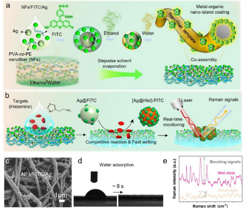 针对肉类食品腐败过程中组胺超标和微生物感染等食品安全痛点,研究团队创新采用乙醇/水溶剂逐级蒸发共组装策略,将银离子、异硫氰酸荧光素与聚乙烯醇-乙烯共聚物(PVA-co-PE)纳米纤维整合,成功制备出一种兼具快速浸润性与超灵敏检测性能的纳米纤维纸基表面增强拉曼光谱(SERS)传感平台。该平台首次实现了组胺检测与抗菌活性的集成,不仅为食品中组胺的快速、超灵敏检测提供了创新方案,也为复杂食品基质的现场安全监测提供了关键技术支撑,有望推动SERS传感检测技术在食品工业中的规模化应用。