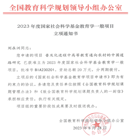 2023年度,他主持申报的《普及化进程中高等教育通向农村的中国道路研究》获国家社会科学基金教育学一般项目立项。