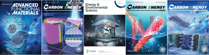 电化学储能领域:在锂离子电池方向,通过原位聚合法可控制备碳纳米管@聚合物“核-壳”异质复合材料(ACS Nano 2024, 18, 23958),解决了聚合物电极导电性差、活性位点少且利用率低的问题,同时提高离子输运能力,构筑了高比特性聚合物基全电池(Angew. Chem. Int Ed. 2024, 63, e202401253);构筑了超细亚纳米线/聚合物复合固态电解质,发现富氢键网络促进了界面锂离子传输(ACS Nano 2025, 19, 29096),阐明了高电压锂金属电池中电极/多相聚合物电解质界面的动态演化、离子输运和耐久性失效机制(Matter 2025, 8, 102168)。在钠离子电池方向,构筑具有连续异质界面的MgTi₃O₇@Na₂Ti₃O₇负极,并在MgTi₃O₇→Na₂Ti₃O₇方向形成内建电场,显著增加储钠位点和离子传输,提高电池比容量和倍率性能(ACS Nano 2025, 19, 10337);基于原位电诱导重构苝二亚胺二钠盐,优化有机正极微结构,构建了超高倍率和超长寿命钠离子电池(ACS Nano 2025, 19, 13097)。在锌离子电池方向,提出了金属锌负极宿主设计的新观点、新思路(Energy Environ. Sci. 2024, 17, 369),通过氧空位工程与二维范德华异质结,构筑了兼具“纳米泵-限域催化”特性的碘正极材料(Matter 2025, 8, 102154),并以两性离子液体为电解液添加剂重构锌负极、碘正极界面,抑制锌枝晶生长、碘单质溶解和多碘离子形成(Nature Commun. 2025, 16, 5565),在超高倍率、超长循环下仍保持其高容量、高稳定性,推动了锌基电池实用化进程。