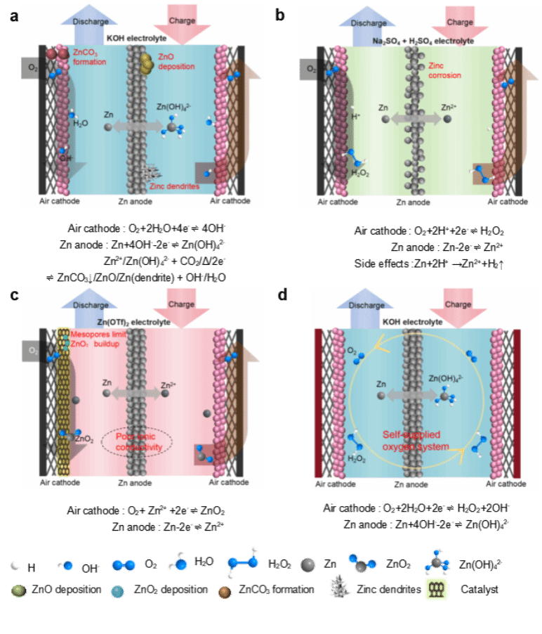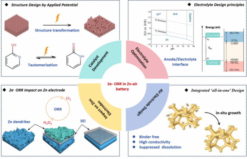 图1 锌空气电池中2e⁻与4e⁻ORR路径的工作机制与挑战对比