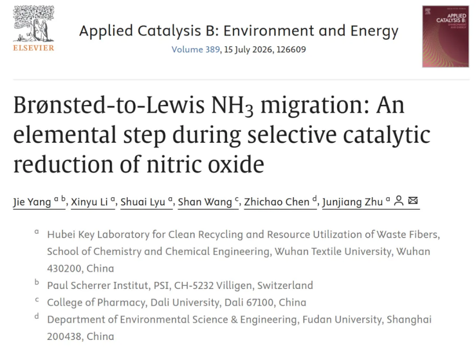 近日,化工学院朱君江教授团队在NH3选择性催化还原(NH3-SCR)反应机理研究方面取得新进展,该研究系统揭示了Ce基SCR催化剂上NH3在Brønsted酸与Lewis酸之间的动态迁移机制,相关成果以“Brønsted-to-Lewis NH3 migration: An elemental step during selective catalytic reduction of nitric oxide”为题发表于Applied Catalysis B: Environment and Energy。武汉纺织大学为论文第一署名单位,团队青年教师阳杰博士为论文第一作者,朱君江教授为论文唯一通讯作者。