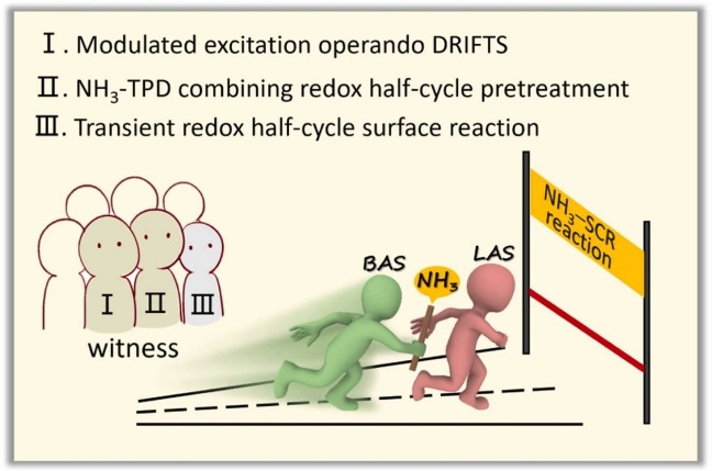 研究团队提出了“氧化还原耦合的NH3迁移机制”:Lewis位NH3直接参与脱硝反应,而Brønsted位作为NH3储库,在O2驱动的Ce3+→Ce4+再氧化过程中持续向Lewis位补给活性物种。该认识从动态角度澄清了两类酸位之间的本质联系。该工作为理解Ce基SCR催化剂中酸性位点的协同机制提供了关键证据,也为面向高效中低温脱硝催化剂的精准设计提供了新的理论依据。