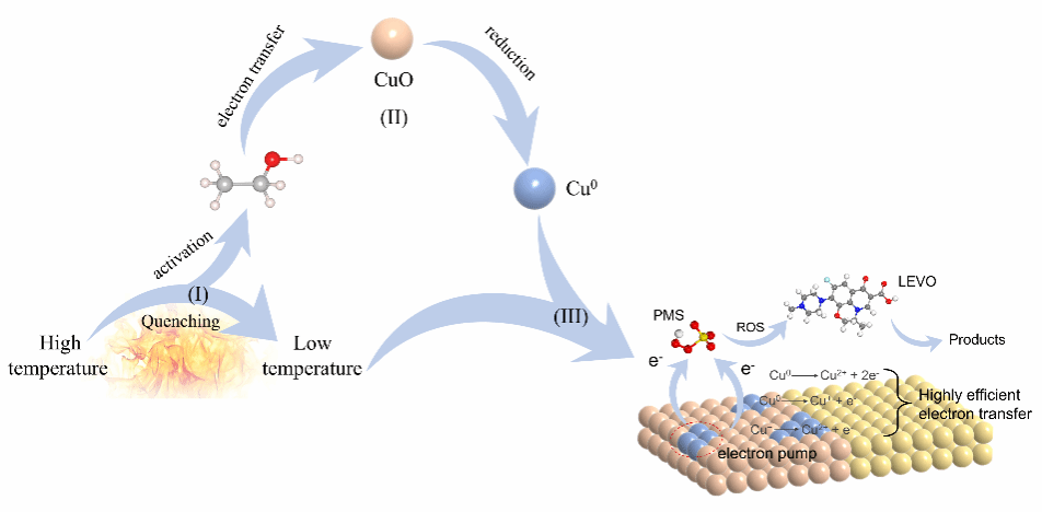该研究聚焦于类芬顿催化领域的关键科学问题:零价铜(Cu0)与一价铜(Cu+)物种的共存虽已被证实能显著提升氧化还原反应性能,但如何在真实反应条件下理性设计并稳定维持这一协同活性位点构型,仍是亟待突破的瓶颈。为此,课题组创新性地引入淬火工程这一非平衡合成策略,利用超高冷却速率将原子动力学捕获于亚稳态,成功突破传统热力学限制,构筑出常规方法难以获得的特殊微结构。基于此,团队发展了一种乙醇介导的快速淬火还原新方法,在二维Cu–CuO/TiO2异质结中原位构建了兼具热力学与动力学稳定性的Cu0/Cu+双活性位点。得益于这种多价态协同架构,催化剂在类芬顿反应中能够自发建立可持续的Cu0 ⇌ Cu+循环,从而大幅提升催化效率。