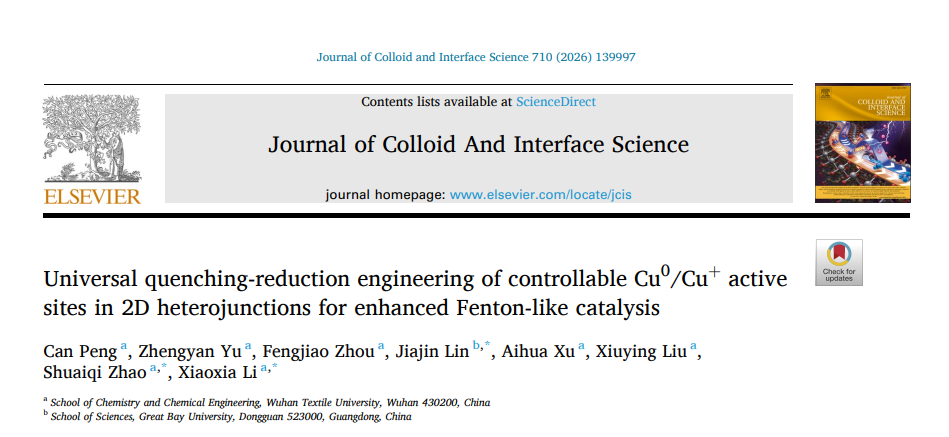 近日,化工学院化学工程与工艺专业2023级本科生彭灿以第一作者身份在国际著名期刊Journal of Colloid and Interface Science(中科院1区)上发表题目为 “Universal quenching-reduction engineering of controllable Cu0/Cu+ active sites in 2D heterojunctions for enhanced Fenton-like catalysis ” 的研究论文。该论文第一署名单位为武汉纺织大学,通讯作者为化工学院李晓霞教授和赵帅奇博士。链接:https://www.sciencedirect.com/science/article/pii/S0021979726001748