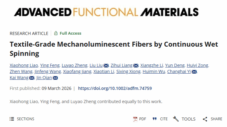 近日,技术研究院先进纺纱织造及清洁生产国家地方联合工程实验室牛仔研究中心易长海教授团队梁子辉副教授课题组硕士研究生廖小红同学在国际权威期刊Advanced Functional Materials发表题为“Textile-Grade Mechanoluminescent Fibers by Continuous Wet Spinning”的高水平研究论文。武汉纺织大学为论文第一署名单位,易长海教授团队硕士研究生廖小红为论文第一作者,武汉纺织大学刘柳老师、梁子辉副教授、易长海教授和浙江大学&浣江实验室王凯研究员和钱劲教授为共同通讯作者。论文围绕机械致发光纤维的连续化制备、结构调控及其在可穿戴光电中的应用展开系统研究,提出了一种面向智能纺织品应用的可规模化新路径。
