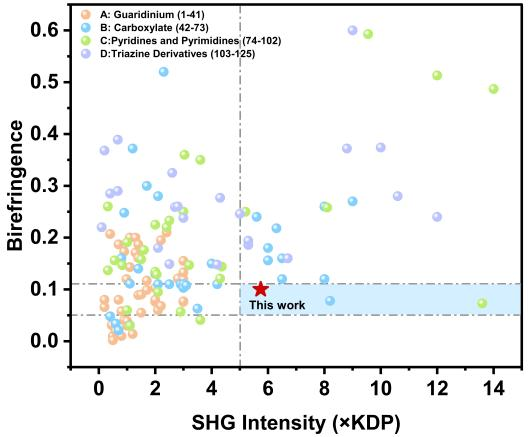 非线性光学晶体是激光技术与光通信技术的核心材料之一,然而,如何将微观结构单元的几何结构特点和电子结构特点在材料的宏观性质中得以传递和调控,一直是材料化学家面临的重大挑战。例如,平面型Π共轭结构单元(例如间苯二甲酸根,硝酸根,碳酸根等),在电子结构和几何结构上呈现出一致的各向异性特征。因此,由该类结构单元构筑的晶体材料通常具有较强的二次谐波(SHG)效应。但由于Π共轭结构单元的强电子结构各向异性,如果形成Π-Π堆积结构往往会导致激光晶体材料双折射率(Δn)偏大,加剧激光的走离效应。目前已知的Π共轭体系材料中,仅有不足3%处于倍频功能应用的最佳双折射率窗口内。