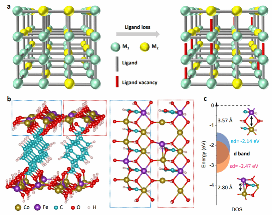 尿素氧化反应因其热力学电位低、可与废水处理耦合,被视为替代传统析氧反应实现节能制氢的理想途径。然而,现有金属有机框架(MOF)催化剂在碱性氧化环境下易发生不可逆结构转变,活性位点快速失活,制约其实际应用。针对这一挑战,研究团队基于MOF材料,利用Fe与Co在碱性高电位下热力学与动力学行为的差异,构建了一种自适应的配位微环境。该结构在电化学活化过程中选择性诱导Co位点产生配体空位,同时Fe位点保留配体结构,进而增强金属-金属相互作用,形成稳定的二聚体构型(图1)。