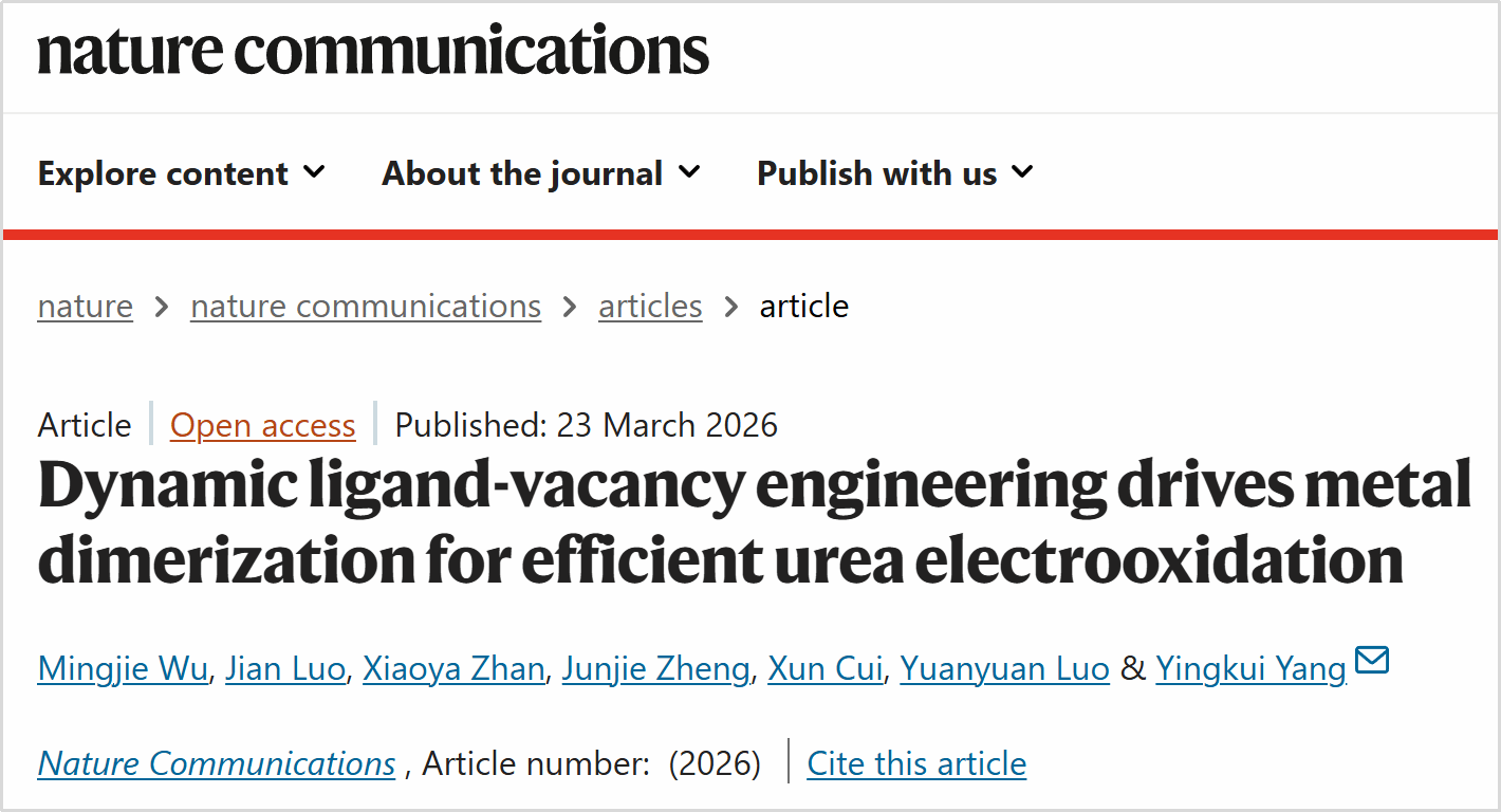 近日,纺织新材料与先进加工全国重点实验室杨应奎教授团队在Nature Communications期刊发表题为“Dynamic Ligand-Vacancy Engineering Drives Metal Dimerization for Efficient Urea Electrooxidation”的高水平研究论文(链接: https://www.nature.com/articles/s41467-026-70919-w)。武明杰教授为第一作者,杨应奎教授为通讯作者,武汉纺织大学为唯一署名单位。