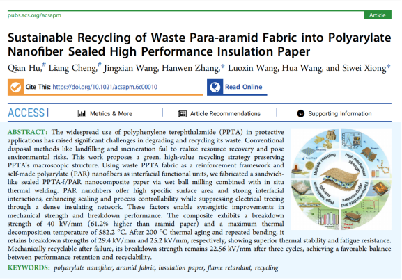 近日,我校材料学院本科生胡茜、程亮以共同第一作者在国际材料学领域权威期刊ACS Applied Polymer Materials上,发表了题为“Sustainable Recycling of Waste Para-aramid Fabric into Polyarylate Nanofiber Sealed High Performance Insulation Paper”的学术论文。武汉纺织大学材料学院为该论文的第一署名单位,材料学院王桦/王罗新团队熊思维副教授为论文的指导老师和通讯作者。