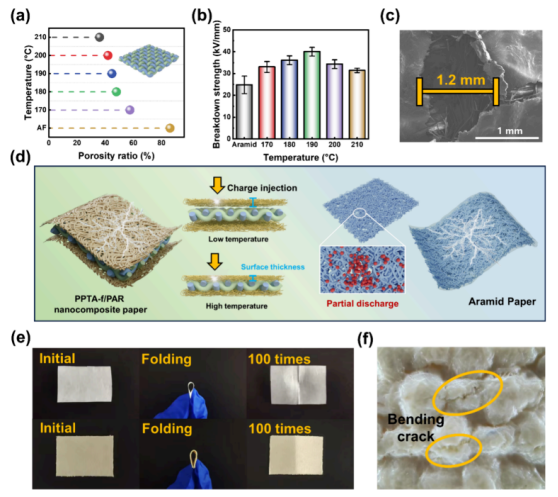 基于氢键与π-π堆积的协同作用,PPTA-f/PAR纳米复合纸构建了强健的分子界面,PAR纳米纤维在高温热压过程中形成致密连续的膜层结构,有效填充PPTA织物内部孔隙,显著降低材料的孔隙率。该结构不仅增强了界面结合强度,还通过致密的绝缘网络抑制电树枝的发展,实现了电气强度与机械韧性的同步提升。该成果在保留废旧芳纶织物宏观结构的基础上,实现了材料绝缘、耐热与力学性能的协同提升,可广泛应用于高压电机、变压器绝缘、柔性电子、航空航天高温绝缘部件等领域,为芳纶材料的闭环回收与高效利用提供了全新设计思路,契合“双碳”目标下绿色制造与循环经济的发展需求。