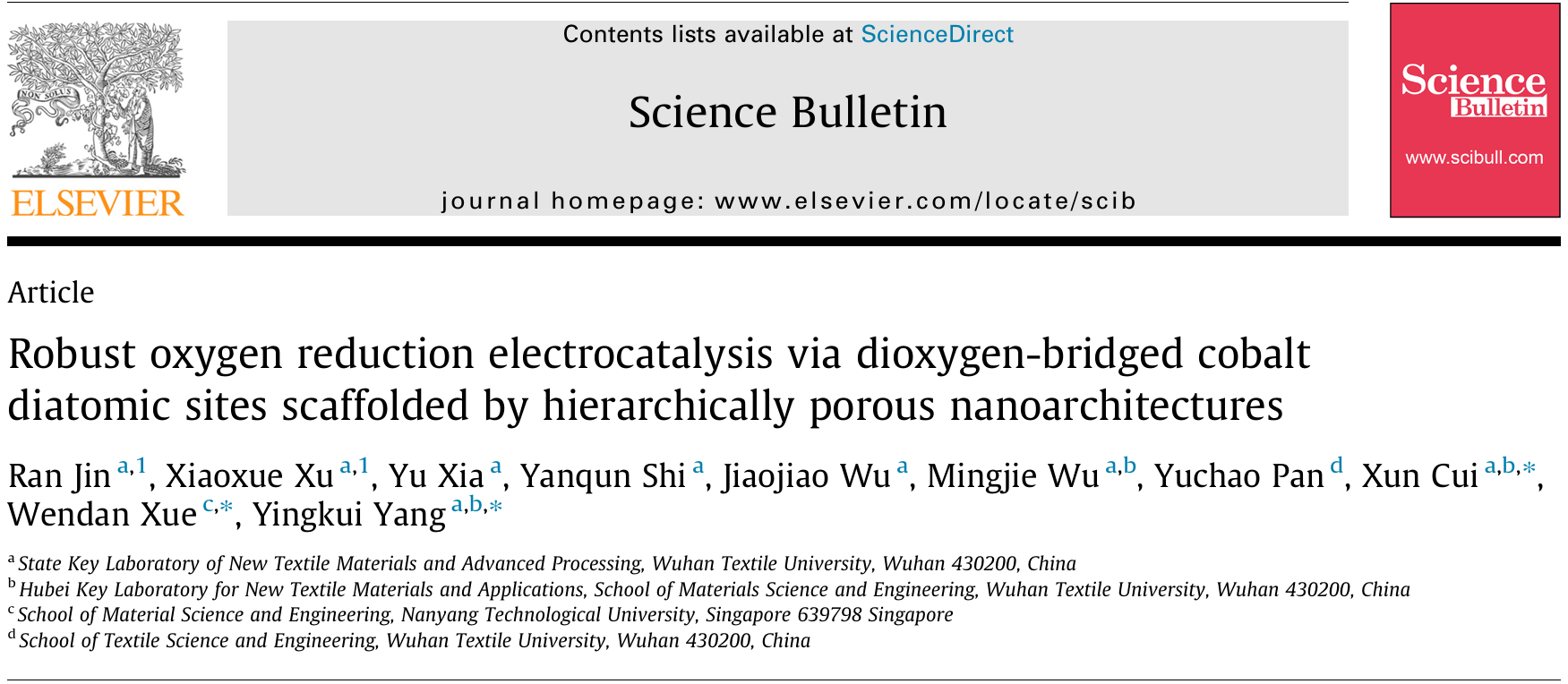 近日,纺织新材料与先进加工全国重点实验室杨应奎教授团队在Science Bulletin上发表题为“Robust oxygen reduction electrocatalysis via dioxygen-bridged cobalt diatomic sites scaffolded by hierarchically porous nanoarchitectures”的研究论文(链接:https://doi.org/10.1016/j.scib.2026.03.010)。论文第一作者为研究生靳冉,通讯作者为崔逊教授、薛雯丹博士及杨应奎教授,武汉纺织大学为第一署名单位。