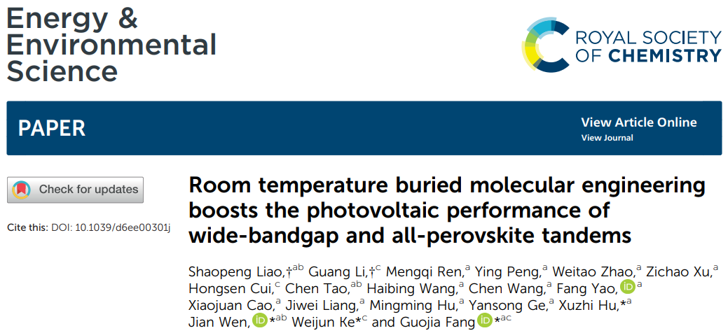 近日,我校电气学院先进能源与未来显示技术团队胡绪志博士等人在国际著名期刊Energy and Environmental Science上在线发表了题为“Room Temperature Buried Molecular Engineering Boosts the Photovoltaic Performance of Wide-Bandgap and All-Perovskite Tandems”(埋底界面室温分子工程提升宽带隙及全钙钛矿叠层太阳能电池光伏性能)的研究成果。武汉纺织大学为第一单位,湖北师范大学及武汉大学为合作单位,联合培养研究生聊少鹏与武汉大学研究生李广为论文的共同第一作者,胡绪志博士、温建博士、柯维俊教授和方国家教授为论文的共同通讯作者。