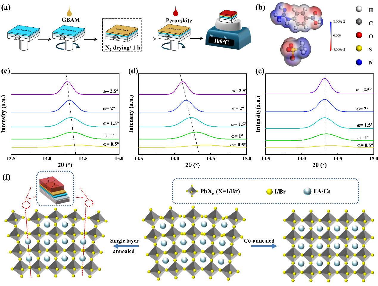 针对以上问题,团队研究人员提出了一种两性离子盐——4-胍基苯甲酸甲磺酸盐(GBAM),用作自组装单分子层和钙钛矿层之间的中间层。该中间层在室温下自然干燥1小时,无需退火处理。这种两性离子盐能够钝化钙钛矿层底部的缺陷,同时填补自组装单分子层覆盖不全产生的空隙,从而形成更致密的中间层。此外,两个湿膜(GBAM层和钙钛矿层)的共退火处理显著缓解了钙钛矿埋底界面的应力,最终实现了高质量的钙钛矿薄膜和器件。