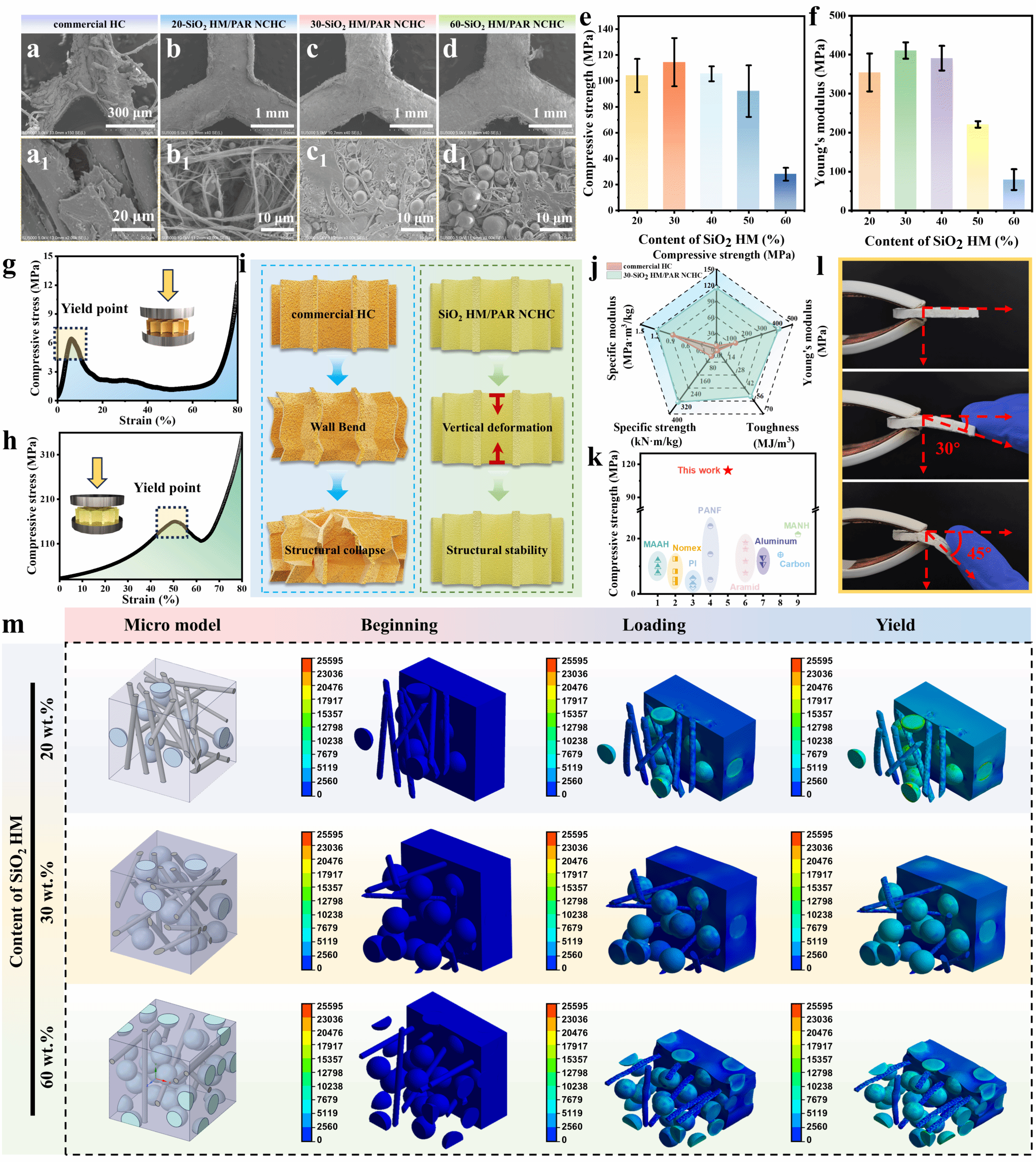 针对上述挑战,研究团队创新性地提出“骨架阻隔-芯层耗散”耦合机制,以自制的热致液晶聚芳酯纳米纤维和二氧化硅空心微球为构筑基元,通过原位热焊接与冷冻干燥策略,成功制备了纳米复合气凝胶蜂窝。该独特结构实现了多尺度协同增强:由纳米纤维与空心微球互锁构成的致密骨架,赋予了材料超高的压缩强度、模量与韧性;而高孔隙率的气凝胶芯层,则通过Knudsen效应、多级散射与粘性耗散,实现了高效的热隔绝与宽频声能耗散。